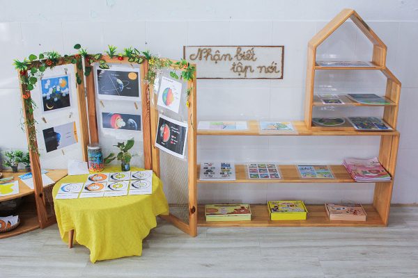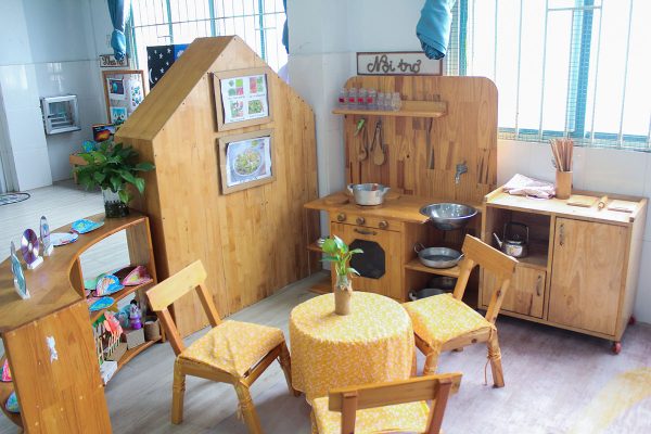 Các phòng học với đầy đủ tiện nghi hiện đại & cơ sở vật chất thân thiện môi trường, được thiết kế như một “xã hội thu nhỏ” với đầy đủ các “góc buôn bán”, “góc sách”, “góc khoa học”, “góc xây dựng”, “xưởng nghệ thuật” … giống như chính xã hội thường ngày. Các con sẽ được đóng vai trải nghiệm nhân vật công phu, đa dạng, dưới sự hỗ trợ của các cô giáo để trẻ được trải nghiệm trọn vẹn các lĩnh vực của cuộc sống và khám phá tố chất, bộc lộ cá tính, tiềm năng phát triển của riêng mình.