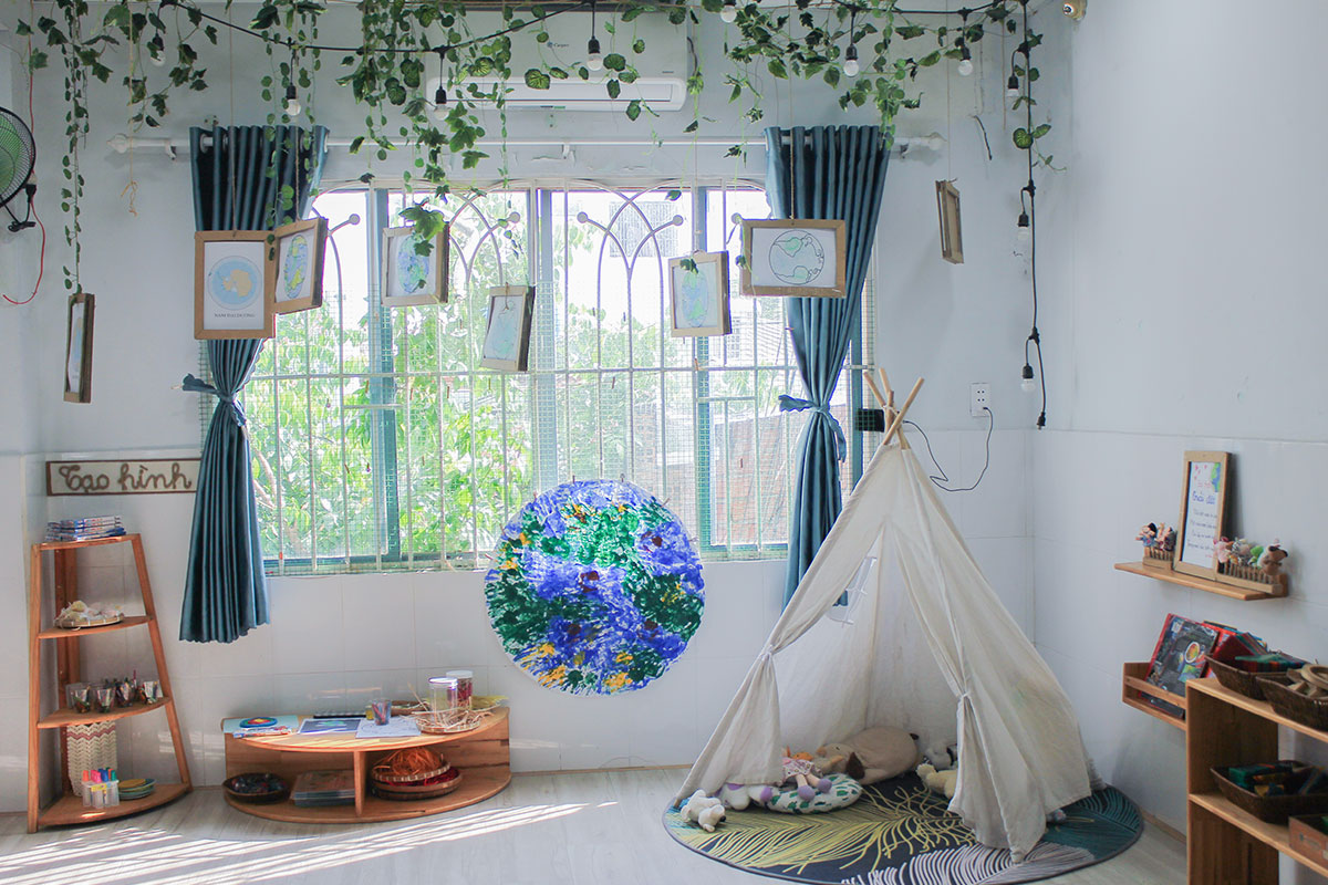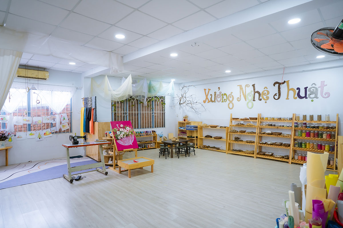 Các phòng học với đầy đủ tiện nghi hiện đại & cơ sở vật chất thân thiện môi trường, được thiết kế như một “xã hội thu nhỏ” với đầy đủ các “góc buôn bán”, “góc sách”, “góc khoa học”, “góc xây dựng”, “xưởng nghệ thuật” … giống như chính xã hội thường ngày. Các con sẽ được đóng vai trải nghiệm nhân vật công phu, đa dạng, dưới sự hỗ trợ của các cô giáo để trẻ được trải nghiệm trọn vẹn các lĩnh vực của cuộc sống và khám phá tố chất, bộc lộ cá tính, tiềm năng phát triển của riêng mình.